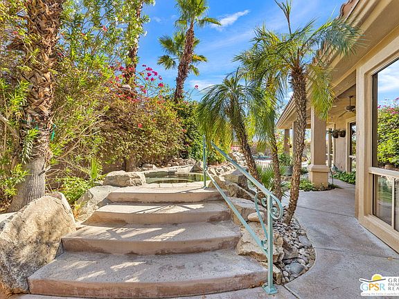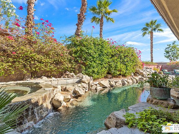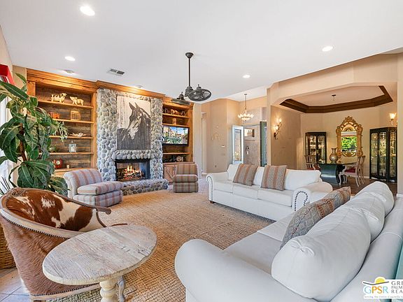 This ultra-private Sun City Palm Desert home, designed around the sought-after Portofino floor plan, sits gracefully on a wide, beautifully landscaped corner lot. Lush plantings wrap the property and create a gentle, retreat-like feel, especially around the pool with its relaxing waterfalls, welcoming firepit areas, and easy outdoor living spaces. A gated front walk and double-door entry open to tall ceilings and a warm, open-concept layout, where a stone fireplace with floor-to-ceiling built-ins anchors the living room and a coved ceiling brings character to the dining area. The kitchen is bright and comfortable with a skylight over the island, a walk-in pantry, and large windows framing views of the PebbleTec pool and spa, built-in BBQ with counter seating, and mountain backdrop. Three ensuite bedrooms offer wonderful separation, including an extended primary suite with dual fireplace shared with the living room, two walk-in closets, a bonus office or workout nook, and a spacious bath with skylight, dual vanities, and separate tub and shower. Guest suites rest on their own wing alongside a powder bath and utility room, plus an extended two-car garage with golf cart space. All of this is set within Sun City Palm Desert, a welcoming 55+ community offering golf, pools, fitness centers, pickleball, tennis, bocce, restaurants, clubs, activities, and low HOA fees that include cable and internet.