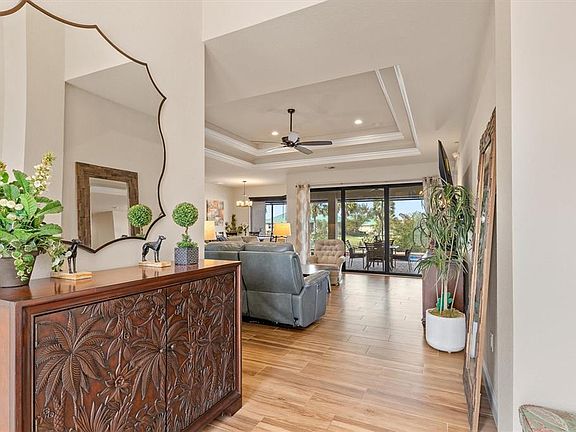 Discover the perfect blend of luxury, comfort, and Florida living in this custom-built 3-bedroom, 3-bathroom, 3-car garage pool home with an office, ideally situated in the sought-after Punta Gorda Isles community. Overlooking the 14th hole of St. Andrew’s Golf Course, this home sits on an oversized corner lot, offering breathtaking views and a peaceful ambiance. The home entrance is located off Suzi St., though it carries a Bal Harbor Blvd. address. A brick-paved, expanded 30-foot driveway leads to a 3-car garage, designed to city maximum limits with a 24-foot width through the covert and right-of-way. Lush landscaping, highlighted by numerous trees and bushes beyond the builder’s original city requirements, is beautifully enhanced with paver-surrounded garden beds finished with 1-1/2” brown and red stone. Landscape lighting in the front yard adds to the home's striking curb appeal. Inside, the thoughtfully designed layout features an expansive great room with double tray ceilings, wood-grain tile flooring, and a wall of sliders that open to the lanai, creating an effortless connection between indoor and outdoor spaces. The gourmet kitchen is a chef’s dream, complete with granite countertops, solid wood cabinetry with crown molding, a center island with prep sink and storage, high-end stainless steel appliances, and a cozy breakfast nook offering stunning golf course and backyard views through a panoramic window. A formal dining room provides the perfect space for entertaining, while the dedicated office/den offers a private retreat. The primary suite is a peaceful escape, featuring tray ceilings with crown molding, custom walk-in closets, plush carpeting, and private access to the pool area. The en-suite bath is elegantly designed with dual granite-topped vanities and a spacious Roman-style walk-in shower. Guests will appreciate two well-appointed bedrooms and two additional bathrooms, one with direct pool access. Step outside to an incredible outdoor living space featuring a 60-foot heated saltwater lap pool with custom tile and marked measurement lines for serious swimmers. A large Hayward pool heat pump ensures year-round comfort. The lanai is finished with a stunning wood ceiling and includes a convenient outdoor sink. An additional water faucet in the backyard adds ease for gardening and maintenance. The 3-car garage is designed for function and comfort, featuring an epoxy-coated floor, insulated ceiling, and a dedicated split A/C unit for climate control. A whole-house solar system helps maintain a lower energy bill. For added convenience, a 12,500-watt portable generator is connected via an outdoor outlet to the main electrical panel (available for purchase outside of sale). Located just minutes from Fishermen’s Village, historic downtown Punta Gorda, Charlotte Harbor, and the new Sunseeker Resort, this home is surrounded by top-rated restaurants, boutique shopping, and entertainment. For outdoor enthusiasts, enjoy world-class boating, fishing, sailing, and pristine Gulf beaches, all just a short drive away. Golfers will love the proximity to championship courses, making this home an ideal retreat for those seeking the ultimate Florida lifestyle.