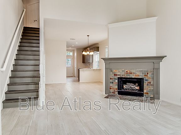 Cozy fireplacePlush carpetModern kitchenGray cabinetsLarge soaking tubTall ceilingsWhite countertops