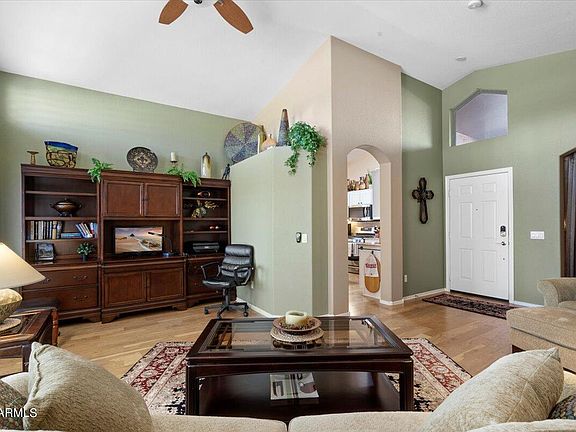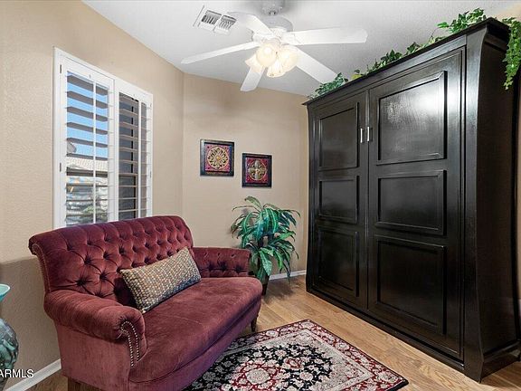 Floorplan that features 2 living areas. 2 bedrooms Plus den with built in murphy bed. GOLF COURSE home on the Tuscany Falls side of Pebblecreek. Panoramic golf course views with home on the 4th hole green & views of entire 5th hole. Brand new wood flooring throughout home. Primary suite has dual vanities and shower. Gourmet kitchen with distressed cabinets, granite counters, stoned backsplash, stainless steel appliances and eat-in kitchen. Plantation shutters on most of the windows. Built-in BBQ and spacious seating area. Enjoy golf and mountain views! Water softener. Home is within walking distance of the Tuscany Falls Clubhouse. MUST BE 55 OR OLDER TO RENT! Variable rates apply