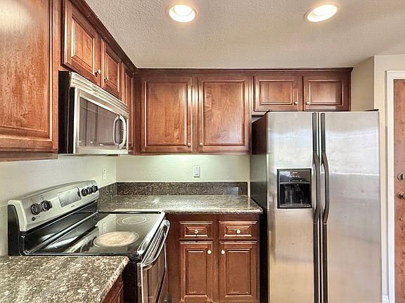 - Beautiful kitchen featuring granite countertops, cherry wood cabinets, and stainless steel appliances.