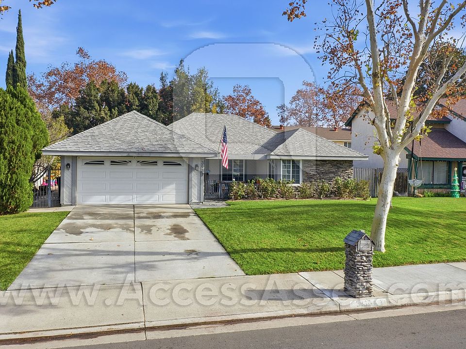Cozy fireplaceFenced backyardAttached two-car garageWood-style vinyl flooringGated entryLush green front yardCovered front patio