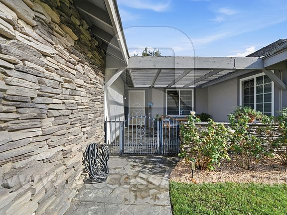 As you arrive, you're greeted by a lush green front yard. The property welcomes you through a covered front patio accented by stacked stone walls, a shaded pergola-style cover, and a gated entry, creating a charming and secure first impression.