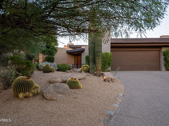 Elegant, stylish, and designed for ease of living, this stunning residence offers the perfect lock-and-leave getaway or a full-time retreat with a true resort-like atmosphere. Contemporary architecture with clean lines, bold angles, and artful corners is complemented by stucco, cinder block accents, and an abundance of picture and mitered windows—each framing soothing desert and golf course views. With its ideal Southeast to Northwest orientation, the home captures soft morning light and ensures sun on the pool throughout the day. Inside, the sought-after single-level living floor plan flows effortlessly, with a thoughtful split layout that enhances both privacy and connection. High ceilings, varying ceiling heights, striking angles, and clerestory windows invite natural light to cascade throughout the home, creating a warm and uplifting ambiance. The home has been beautifully updated with luxurious finishes that elevate every space. Highlights include rich Knotty Alder cabinetry, an expansive 5' x 9' island perfect for gathering, professional Wolf and Sub-Zero appliances, elegant chandeliers and fixtures, and spa-like bathrooms with floor-level walk-in showers. Easy-care tile flooring extends throughout, balancing beauty and practicality. Living spaces are designed for every mood and occasion. A welcoming great room with a fireplace showcases windows that capture panoramic mature desert and golf course views. A cozy den provides the perfect retreat for relaxation or TV watching. The formal dining room is graced with equally captivating vistas, while the expansive kitchen island and casual dining areasurrounded by mitered windowsinvite conversation and comfort. The primary suite is a private haven behind double doors, offering a tranquil fireplace, direct patio access, and a spa-like bath with dual vanities, a freestanding soaking tub, a walk-in shower with bench and triple showerheads and a private water closet with toilet and bidet. A "to die for" completely remodeled designer closet completes this private haven. Two additional guest suites are equally well-appointed, one with double door entry, each featuring patio access, spacious closets, and updated ensuite baths. The outdoor living experience is exceptional, with a sparkling pool and spa, a wrap-around patio, covered dining and lounging spaces cooled by ceiling fans, and a built-in barbecueperfect for entertaining or quiet evenings under the stars. This seamless indoor-outdoor connection allows you to enjoy casual desert living year-round. Nestled in a premier Desert Mountain location, the home is within minutes of the Sonoran Fitness Club, 20 miles of scenic hiking trails bordering Tonto National Forest, and convenient access to both the front and back guarded gates. With seven world-class golf courses and clubhouses with restaurants nearby, every day feels like a vacation. Whether you're seeking your forever home or a private desert sanctuary for seasonal escapes, this exceptional property captures the essence of refined living in Desert Mountain. No membership is included, but Memberships are available through The Desert Mountain Club via a waitlist.