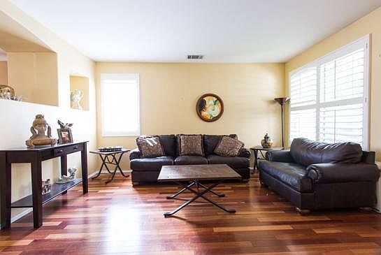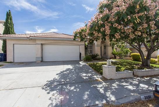 Beautiful 4 bed 2 bath home in Palmdale in the beauty of Rancho Vista in a great location close the Rancho Vista Golf Course, AV Mall, the 14 FWY and many schools, shops and restaurants. Gorgeous and perfectly trimmed landscaping with Sago Palms. Brazilian Kempas Hardwood flooring throughout, spacious living and family rooms, with a fireplace and entertainment niche in the living room and open access to the kitchen. Kitchen has plenty of cabinet space, Corian counters, awesome breakfast bar and built-in appliances, water softner, and sliding door access to the patio. Individual laundry room with cabinets next to the garage. Great bedrooms and bathrooms. Entertainers backyard with large covered patio, notable Alan Jackson IGG black-bottom pool with paid off solar panels for heating and an IGG Spa pool and grassy area. 3 car garage. This is the perfect family home! A must see!
