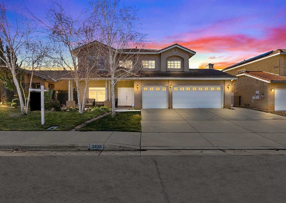 Be awestruck by this lavish 2-story West Palmdale Pool Home. Travel inside & fixate on natural light glistening through plantation shutters & bouncing off high ceilings & neutral painted walls. Notice recessed lighting illuminating the entire home. Wander across new engineered hardwood floors & be drawn into the dining room enhanced w/ built-in storage, a show stopping chandelier & luxurious fireplace. Further, find a newly remodeled chef's kitchen w/ a mammoth marble center island w/ overhang for seating. Enjoy the plethora of bright white cabinetry w/ nickel plated hardware, a copious amount of granite countertops w/ subway tile backsplash & stainless steel appliances. Unwind in the backyard oasis equipped w/ a stunning solar heated pool & spa w/ a majestic waterfall, built-in BBQ & stamped concrete. Upstairs find the gigantic master suite with a relaxing private bathroom. Title shows home as a 7 bedroom, it's now 5 after increasing the size of bedrooms. 12 year prepaid solar.