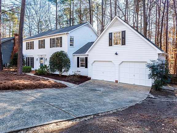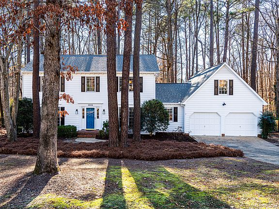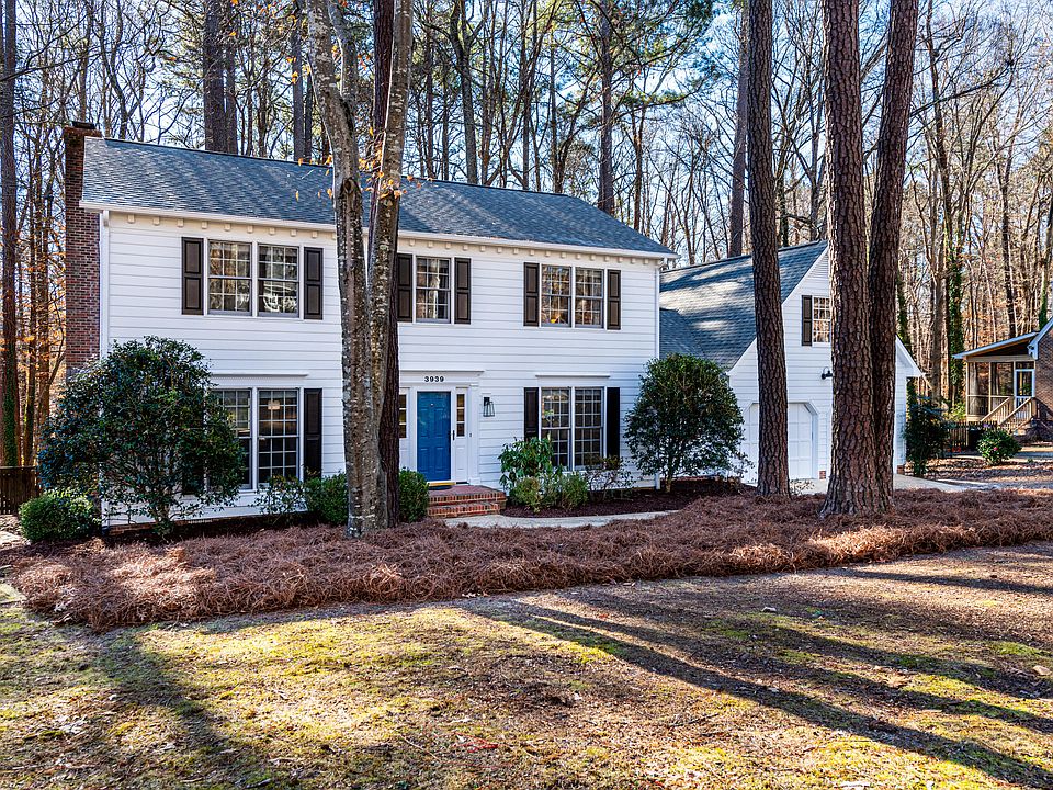 Quintessential traditional four-bedroom, two-and-a-half bathroom floorplan, nicely updated over the years with new light fixtures and primary bath has been completed remodeled; guest bathroom mostly updated; kitchen white cabinets with granite counters and stainless appliances, walk-in mudroom with extra storage at washer and dryer; large lot, new screen porch and deck are gorgeous; overlooks forested and level backyard; formal rooms included with continuity between the living and family room; fireplace and built-in bookcases; hardwood floors throughout most of home including much of upstairs; exterior recently repainted; EV car ready with charger in place; oversized attached two-car garage with walk-up attic above; CPI security system, and fully fenced backyard; Convenient to 40, 751, American tobacco trail, Southpoint Mall