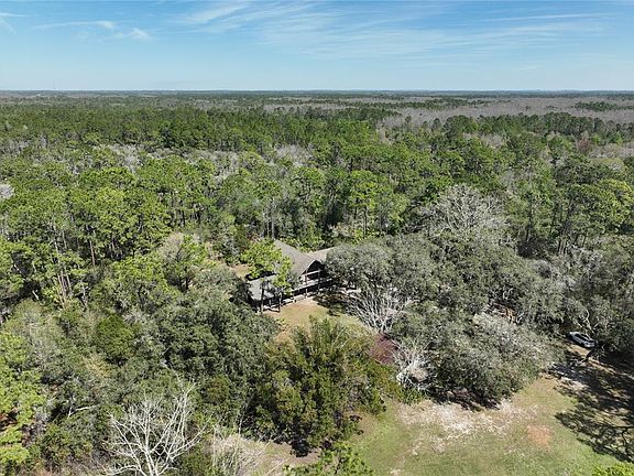 36.8 ACRES OF PRISTINE, WOODED LAND, PRIVACY AT IT BEST and a ONE-OF-A-KIND THREE STORY HOME! Cross between old Florida and Swiss chalet architecture. Clad entirely in old growth pecky cypress and situated among canopying oaks, towering long leaf pines, and stands of old cypress trees, this home was meticulously designed and constructed to blend seamlessly into its natural surroundings. Upon driving up the tree covered driveway, a 72 foot wide front porch welcomes you with plenty of seating space to just relax and enjoy the outdoors. As you walk through the double doors at the entry of the home you are greeted by a large foyer and a living room with a CATHEDRAL CEILING, EXPOSED WOOD BEAMS, a WOOD-BURNING FIREPLACE, and tons of natural light flooding in from windows all the way around allowing the beauty of the private land to be seen from every angle. It’s the kind of space where you can watch deer or turkeys pass by at sunrise or listen to the call of owls from the comfort of your sofa. As you continue through the home, you are treated to woodland views from every room. Connected to the breakfast nook and family room is a large, screened back porch providing another perfect place to slow down and unwind while listening to the swaying pines and vibrant birdlife and watching butterflies float by. The home offers two beautiful loft areas perfect for reading or just having a quiet moment to reflect. These loft areas look out to the wooded property as well as overlooking the foyer and beautiful living room. The largest guest bedroom, which could be a secondary primary suite, has a walk-in closet and is pre-plumbed to have its own private bathroom. A large balcony connected to this bedroom and the loft, offer more space to take in the gorgeous landscape and even stargaze in the dark, night sky. You will find an unfinished attic on the second floor that can be accessed through a full size door. This area is great for storage or could easily be finished as additional living space. As you walk up the stairs to the THIRD FLOOR you will walk into another attic space with windows and natural lighting, and this area could also easily be converted into more additional living space. This home has a SECOND HOME ON THE PROPERTY that has power but just needs water hook up and A/C. With solid heart of pine wood floors, this would be a PERFECT ART STUDIO, WORKSHOP or ADDITIONAL COTTAGE DWELLING UNIT. Across the road, OPEN PASTURE ADDS POTENTIAL FOR HORSES. Let your imagination run wild with the ENDLESS OPPORTUNITIES that this property has to offer with even current future land use allowing for one residents per 5 acres of land also allowing additional dwelling unit, barn, stables, etc! GREAT FUTURE POTENTIAL WITH THIS PROPERTY! This home is located in a beautiful, quiet, rural area tucked away from the hustle and bustle yet has easy access to anywhere you want to go! This home is located about a half hour to all shopping in Clermont on Hwy. 50 and one hour to Orlando International and Tampa International Airports. Easy access to the Clermont and Harris Chain of Lakes. Only a couple minutes from the 800 acre Pasture Reserve with miles of hiking trails. Just about 30 minutes to Colt Creek State Park, Lake Louisa State Park, Green Swamp East Tract and just about one hour to Ocala National Forest. Don’t wait to come see this beautiful piece of paradise!