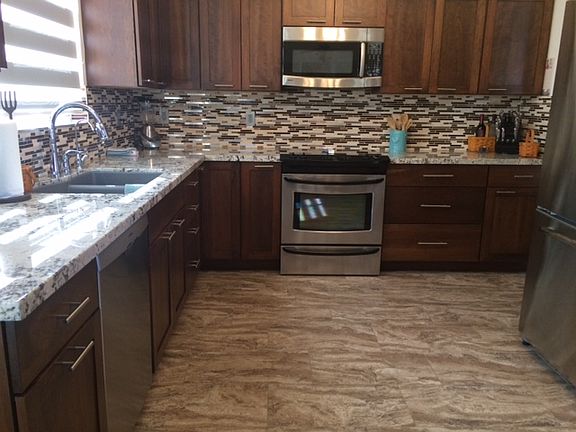 This remodeled single level home is waiting for you! Providing an easy care front landscaping with beautiful grassy area and stone accents on the facade. Bright and welcoming interior is complete with 4 bed, 2 remodeled bathrooms, luxurious light fixtures, archways throughout, and neutral color palette. Gourmet eat-in kitchen has everything you need; sparkling stainless steel appliances, lovely back-splash, granite counter-tops, and soft-close cabinetry with crown molding. Lavish master suite has picture windows, spotless full bath with dual vanity, separate tub, step-in shower, and walk-in closet. This impressive oversized backyard with covered patio, grassy area, large coversation area and refreshing pool is ideal for your gatherings. All ready for you to come and enjoy.