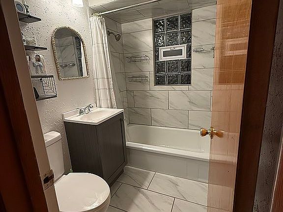 The remodeled bathroom offers a fresh, modern touch with stylish finishes, making it both functional and inviting.