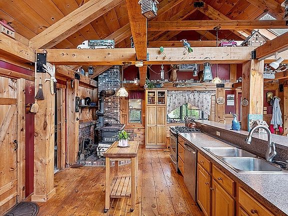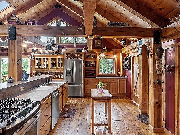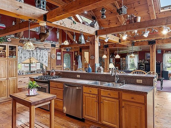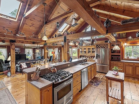 - Features: Wood / Coal / Pellet Stove, Skylight, Cathedral Ceiling(s), Beamed Ceilings, Flooring - Wood, Window(s) - Bay/Bow/Box, Countertops - Upgraded, Kitchen Island, Breakfast Bar / Nook, Country Kitchen, Open Floorplan, Stainless Steel Appliances, Gas Stove, Lighting - Pendant
