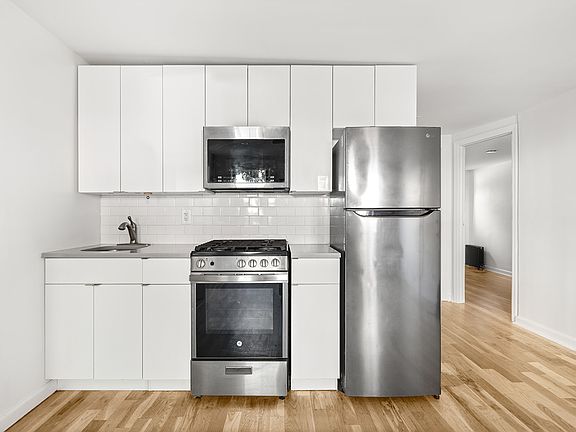 As you enter, you are greeted by a bright and airy kitchen and living area, accented with hardwood floors, two large windows allowing great natural light, and gorgeous original details. The kitchen stands out with its sleek stainless steel appliances and attractive white cabinetry.