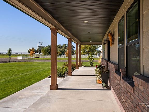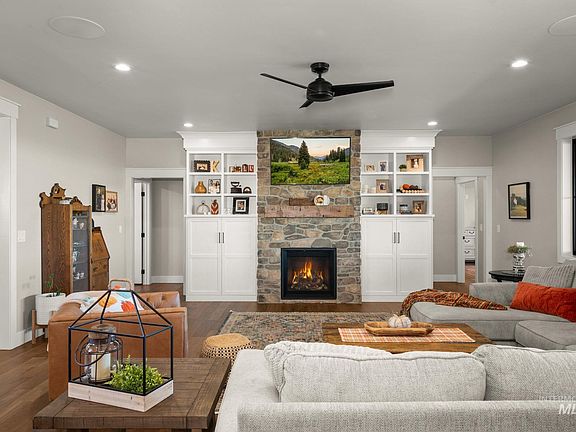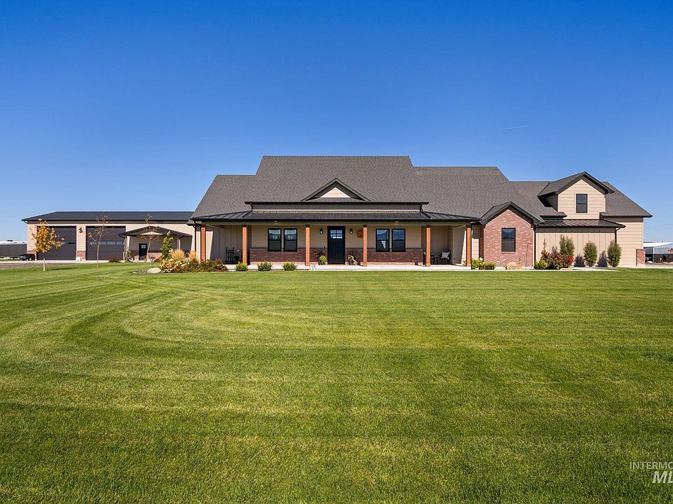 Modern Country Luxury on 3 acres! This custom home blends high-end finishes with open, inviting spaces for effortless family living. The gourmet kitchen features quartzite countertops, a 6-burner propane range with grill, dual ovens, pot filler, spacious butler’s pantry, and all kitchen appliances included. With a formal dining room and open layout, it’s perfect for gatherings and home cooking. The living room showcases 10-ft ceilings, custom built-ins, and a striking floor-to-ceiling stone fireplace that anchors the home. The primary suite with vaulted ceiling offers dual vanities, a tiled walk-in shower, soaker tub, and generous closet with built-in safe room. A versatile craft or office space adds flexibility for work or hobbies. Outdoors, unwind on the covered patio with hot tub, gather by the firepit, or tend the garden surrounded by open country views. The landscaped yard features curbing, vinyl fencing, sprinklers, Burley irrigation shares, and an RV hook-up. The insulated and heated 70'×40' shop provides space for projects, storage, and a man room with A/C, kitchenette, and half bath. Move-in ready—This Home is where modern comfort meets Idaho country living.