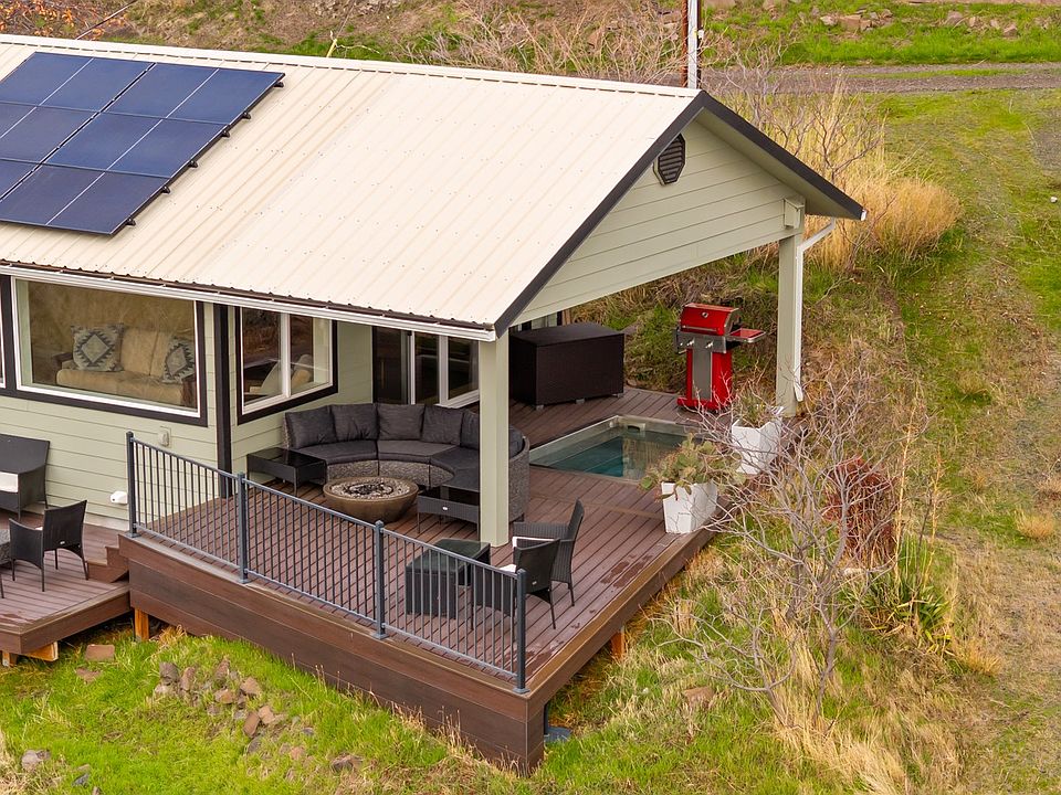 Escape to your own Gorge retreat overlooking the bluffs and the Columbia River. This fully furnished 2-bedroom, 1-bath cottage offers 820 sq ft of light-filled living space designed for relaxation, nature watching, and peaceful getaway living.Perched above the river, the home features recent exterior upgrades including a newer metal roof, fiber-cement siding, new gutters, solar panels, and low-maintenance Trex decking. The wraparound deck captures sweeping views and includes a built-in stainless-steel hot tub plus two built-in propane fire pits, perfect for cozy evenings and unwinding under open skies.Inside, the cozy living room is framed by large picture windows that look out across the bluffs—a perfect spot to watch wildlife, sunsets, and the changing seasons. Carpeted bedrooms and living room create comfort, while tile flooring in the kitchen, hallways, and bathroom offers durability for an easy-care lifestyle. The updated bathroom features a tile shower, and efficient mini-splits keep the home comfortable year-round.Whether you’re seeking a weekend getaway, a furnished second home, or a ready-to-rent vacation retreat, this charming cottage delivers tranquility, views, and the true Columbia River Gorge experience.**GPS will not take you directly to house because they have turned it into a one way st. From Hwy 14, once you take a right on Boulder, take a right on Ross st, Right on Bluff rd, left on Fallbridge Rd. When leaving you will back out, turn left out of Fallbridge down the one way and will take you back around through town to Boulder Rd. **Sellers will pay off solar panels prior to close.
