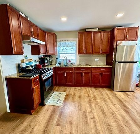 Recently renovated 2nd floor apartment with amenities galore. Available November 1st. Relax in your spacious living room and enjoy the large, modern updated eat-in-kitchen. There is a stainless steel dishwasher, stove, and LG refrigerator. Cherry wood cabinets and granite countertops with plenty of counter space. Both bedrooms have double closets. Primary bdr is 11x14 and add'l bdr is 9x11. The full bath has a ceramic tiled shower over tub and vanity. Plenty of updated windows let the sunshine in. There is recessed lighting and Pergo floors throughout the apartment. Tenants have an extra closet for storage in hall at top of stairs and use of the rear yard. One designated off street parking space is included. No commercial trucks or vans allowed to park in driveway. One small car is ok in the designated spot. Town allows street parking. Landlord is responsible for lawn maintenance and snow removal. Tenant pays for their own electricity and heat. Fios and Optimum are available. Convenient to shops, transportation, parks and malls. Application, credit check, proof of employment and interview are required. **Sorry NO PETS.**Tenant to pay first $150.00 of each repair. A real Gem!