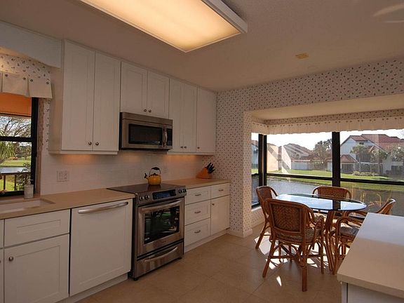 This renovated three bedroom condo is ideally situated on a point of land that affords views up and down a sparkling river of water, with the scenic 9th green and American flag highlighting this beautiful picture. Eastern and southern exposures creates a warm, sunny atmosphere inside, and a comfortable setting on the screened patio all day long. The spacious, open floor plan features vaulted and tray ceilings, crown moldings, bright white renovated kitchen with new appliances, renovated bathrooms with Jerusalem Limestone in the master bath. 3rd bedroom / den has built-in shelves and cabinets and its own open patio. Excellent space and setting.