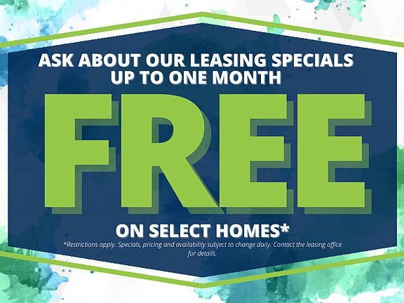 - Special offer! Ask about our leasing specials! Up to one month free on select homes! Call today to book a tour! *Restrictions apply. Specials, pricing and availability subject to change daily. Contact the leasing office for details.