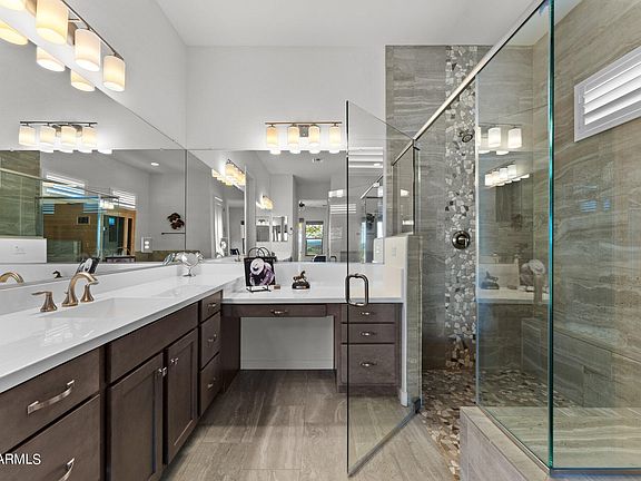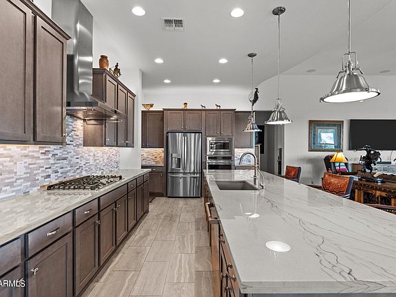 Welcome to your dream oasis nestled in the serene landscape of Wickenburg Ranch!! This luxurious 3000 square foot home boasts breathtaking views that will leave you in awe every day. Step inside to discover a massive kitchen, meticulously designed with numerous appliance upgrades, perfect for the culinary enthusiast. Adorned with a stunning tile backsplash and granite countertops, the kitchen exudes both elegance and functionality. As you wander through this impeccable abode, you'll be greeted by beautiful timeless tile floors that add a touch of sophistication to every room. The spa-like bathrooms are a sanctuary unto themselves, featuring a rejuvenating sauna for ultimate relaxation. The oversized laundry room serves as a multifunctional space, doubling as an office to accommodate your lifestyle needs seamlessly. Step outside to your own private paradise, where a gorgeous outdoor living space awaits. An artistic fountain sets the tone for tranquility, while the travertine tile extended length patio provides the perfect setting for al fresco dining or simply soaking up the sun. Entertain with ease in the built-in outdoor kitchen, remote controlled screens, complete with all the amenities you need to host memorable gatherings. The landscaping is meticulously curated, enhancing the beauty of your surroundings and creating a serene ambiance. Keep your utility bills low with OWNED solar panels!! The home comes with HOA approved plans for a 795 sq ft Casita plus an RV garage!