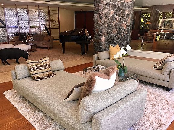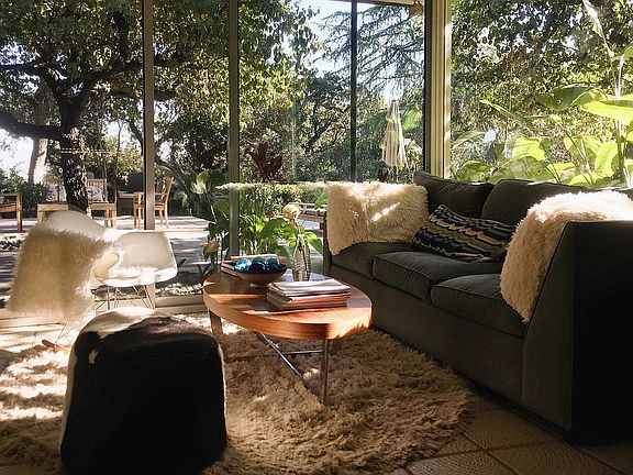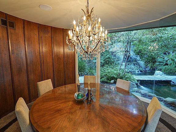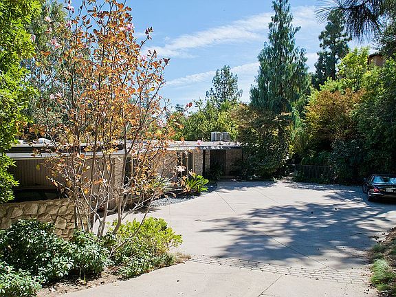 Classic Robert Earl designed, one-story modern estate on a nearly acre lot in the heart of Royal Oaks. One of the finest combinations of house, pool, yard and privacy to be found anywhere. This unspoiled, classic 1950's modern seems conventional at first glance, with earth-hugging horizontal lines; within, however, space swells and swirls into the dynamic elliptical curves of an open plan double- living room and sunroom, affording a Cinemascope vision of lush foliage, manicured foothills and distant mountains via floor-to-ceiling glass. The kitchen, a near double-square, orients to the large swimmer's pool and raised spa through a breakfast area and surveys the grassy yard. The circular formal dining area opens on one side to mature trees and far off mountain tops while the other side faces a sheltered Japanese garden with cascading waterfall and koi pond off the auto-court. There, 6-car parking complements a 2-car carport beyond which is the approximately 1100 s.f.-plus garage with a wall of windows opening to the verdant hillside and Valley below. Hidden from the street and neighbors behind a gate and down a driveway, this mid-century Arcadia seamlessly unites nature and architecture. Just minutes from the Getty, UCLA, Brentwood and Ventura Boulevard’s restaurants and services.