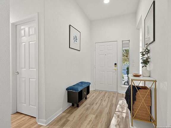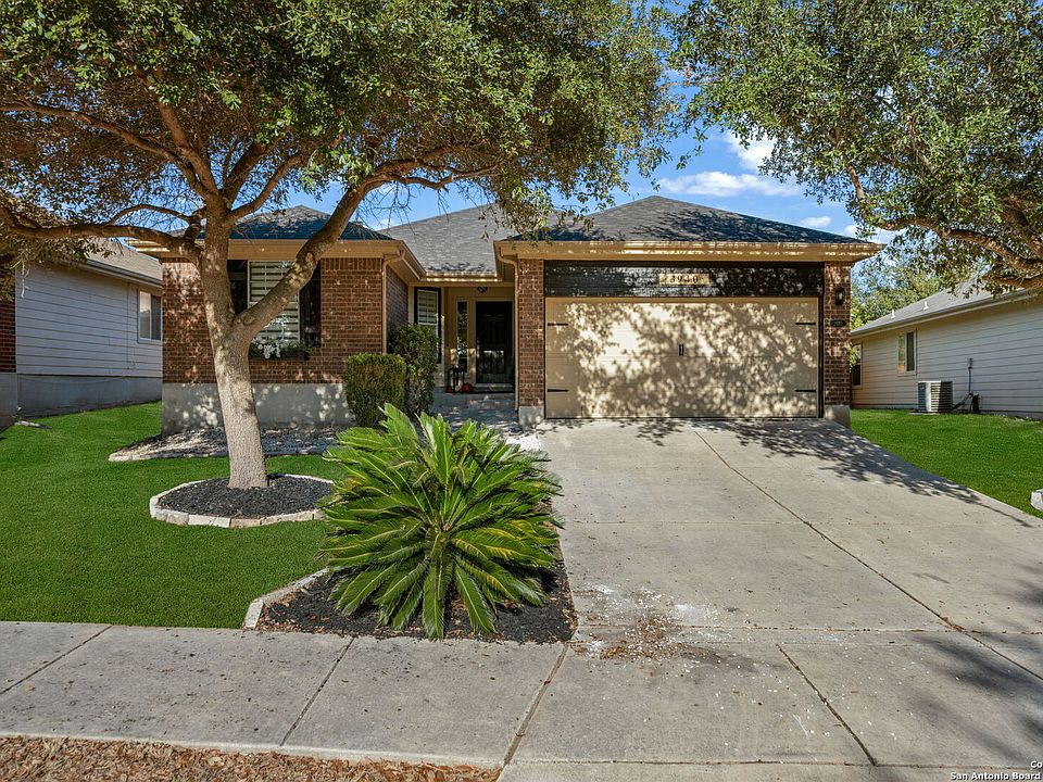 Welcome to 3940 Whisper Field, a beautifully updated single-story home in the heart of Cibolo offering the perfect blend of comfort, style, and convenience. Step inside to discover an open and inviting layout featuring vaulted ceilings, modern flooring, and a statement black-accent fireplace wall that adds warmth and sophistication. The kitchen has been thoughtfully refreshed with beautiful white cabinetry, elegant quartz countertops, a full-height tile backsplash, and stainless steel appliances-all flowing seamlessly into the bright dining area with large windows that fill the space with natural light. The spacious primary suite offers a relaxing retreat with vaulted ceilings, a generous walk-in closet, dual vanities, a soaking tub, and a separate shower. Two additional bedrooms and a full bathroom provide versatility for guests, a home office, or playroom. Step outside to enjoy the peaceful backyard complete with a covered patio, lush lawn, and a charming custom fire pit area-ideal for gatherings under the Texas sky. This home also features a brand-new roof with a transferable warranty, providing peace of mind and lasting value for years to come. Situated in the desirable Whisper Meadow community near I-35, Randolph AFB, local shopping, dining, and great schools, this home truly offers modern living with thoughtful updates and timeless appeal.