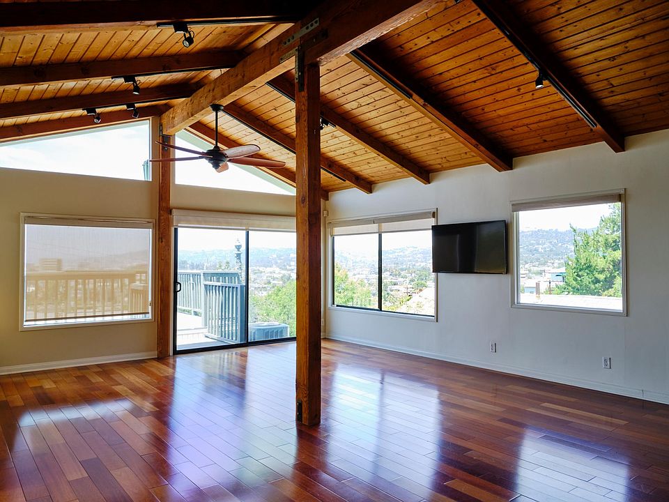 **Multi-level one-bed, two-bath apartment, with an expansive rooftop deck in front and secluded patio in back.** This Silverlake property sits atop a hill and looks out at the Franklin Hills, the Hollywood Sign and Griffith Observatory, with the Pacific in the distance. The open floor plan and the downstairs bedroom give the apartment a particular sense of spaciousness. Hardwood floors of cherry and timber bamboo, plus maple cabinets and stone counters. Filled with light. Situated between Vermont and Hillhurst to the west, with Silverlake Reservoir just over the hill to the east, and Sunset Junction down the hill to the south. **Tours available Saturday and Sunday**