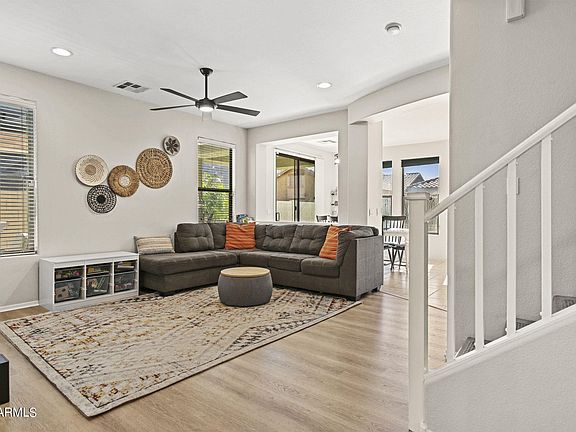 Prepare to fall in love, as this effortlessly cool home HAS IT ALL! Nestled on an interior lot, in low-turnover Pecos Manor, this home's aesthetic and craftsmanship are sure to impress. The open concept floorplan is loaded with character and impeccable design. You'll find 3 bedrooms and 2 bathrooms upstairs, with an office/flex space and powder room downstairs. The office/flex room is enveloped in a custom, high-end acoustic glass wall which adds both function and style. The generous kitchen offers an amazing space to prep and enjoy meals with classic oak cabinetry, large island, pantry and updated stainless steel appliance package (gas range/double oven, dishwasher, built-in microwave & refrigerator are included). Elegant white oak LVP floors are paired with new carpet and neutral tile. The primary suite offers a large walk-in closet and private bath with soaking tub, separate shower and private water closet. A custom-designed mudroom offers organization + storage for daily essentials with bench seat. There is so much to enjoy with the thoughtfully-designed outdoor spaces. The front of the home offers desert-adapted landscape, paver-lined driveway, cozy front porch. An upstairs bedroom has a French door that opens to the charming Juliet balcony. Enjoy gathering with family and friends in the redesigned rear yard with sprawling luxury synthetic lawn, producing lemon tree, hearty plants with drip irrigation, bistro string lights, covered patio and shaded ramada. Additional highlights: new HVAC '22, garage epoxy floors, updated interior and exterior paint, inside laundry (washer + dryer included), updated fixtures + hardware, new lighting/ceiling fans and upgraded window coverings. Pecos Manor residents enjoy amenities including a sail-shaded playground, numerous walking paths, lush greenbelts with mature trees, a sand volleyball court and 1/2 basketball court. Epic location is close to many Gilbert destinations including Epicenter at Agritopia, Verde at Cooley Station, San Tan Village Marketplace, the Riparian Preserve at Water Ranch, Gilbert Farmer's Market, Discovery Park and Gilbert Regional Park. Convenient to the loop 202 and Phoenix Mesa Gateway Airport.