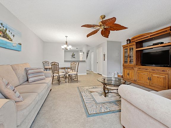 Tranquil water views await in this townhome with an updated kitchen -- spectacular quartz countertops and cabinets with soft-close feature, additional matching counter space and cabinets installed when kitchen renovated 6 years ago. No carpet on first floor. Two large bedrooms upstairs. Downstairs room used as a Den, does not have a closet but identified as 3-bedroom on Property Appraiser database. Full-size washer and dryer. A/C system replaced 7 years ago. Water heater replaced 6 years ago. Screen patio has a solid roof, replaced by the HOA in March 2023. Roof is the responsibility of the HOA, main roof replaced in 2018. Two assigned parking spaces in front of home. Max 2 household pets. Furniture negotiable except art. $1494 Capital Contribution due from Buyer at closing