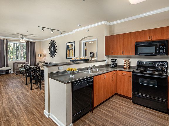 - Exterior features: *In select units, Airy 9-foot ceiling with crown molding, Balcony, Business Center, Conditional Deposit - 1 Month Rent, Convenient built-in desks*, Energy-efficient dual pane windows, Granite-inspired kitchen counters, Open Spacious Floorplans, Private garages* (some with direct access), Quick access to highway 74 and I-15, Sleek black kitchen appliances, Sophisticated two-tone paint, TV Lounge, Warm cherry cabinetry with satin nickel hardware