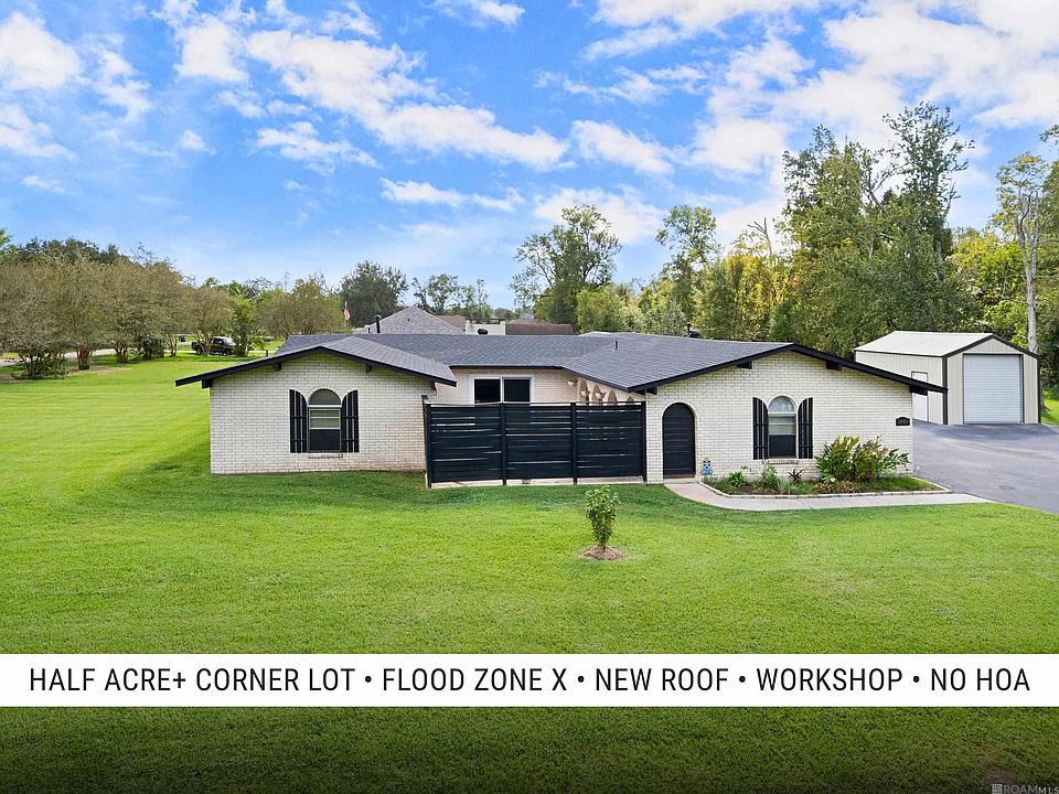 Looking for a home in Prairieville with no HOA, a corner lot over half an acre, and a brand new roof? This one has it all. Located in Flood Zone X, just one minute from Prairieville High School and Prairieville Primary, this move-in ready home offers 3 bedrooms and 2 bathrooms with custom tile showers, granite countertops, and stainless steel appliances including a gas stove, dishwasher, and built-in microwave. New sliding glass doors in both the living room and master bedroom lead to a private courtyard, and the master includes its own mini-split AC unit for extra comfort. Outside you'll find a fully fenced backyard, covered rear patio, extended parking area, and a two-car garage. The separate workshop adds valuable storage or space for hobbies. Homes for sale in Prairieville with a workshop and no HOA are hard to find, so don't miss this one.