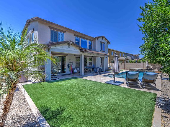 Upstairs, you'll LOVE the HUGE loft. Two of the additional guest bedrooms have Jack & Jill bathroom, fourth guest bedroom has full bath too! Primary suite is oversized and features dual walk in closets, en-suite bathroom with garden tub, walk in shower and additional linen closet. Your backyard is perfect for entertaining. Large covered patio, pool, turf & more!
