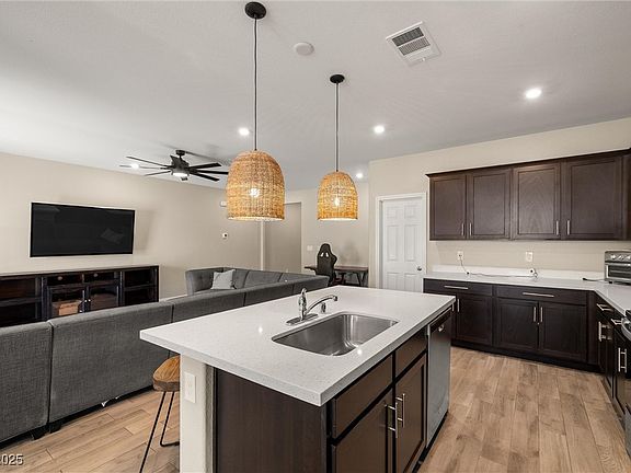 Welcome to a beautifully maintained single-story home in Pahrump’s desirable Burson Ranch community. This 4-bedroom, 2-bath home offers 2,022 sq ft of open living space with vaulted ceilings, a formal dining area, and a spacious kitchen with island and ample cabinetry. The primary suite features a large walk-in closet, dual sinks and a large shower. All rooms have ceiling fans and energy-efficient double-pane windows. Enjoy low-maintenance desert landscaping with turf, solar lighting, BBQ pad, and space to add a pool or spa. The 2-car garage and possible RV parking offer great storage and flexibility. Located in a quiet neighborhood with low HOA fees and close proximity to parks, schools, and golf. Just an hour from Las Vegas, this move-in-ready home combines modern comfort with small-town charm. Don’t miss this opportunity—schedule your showing today!
