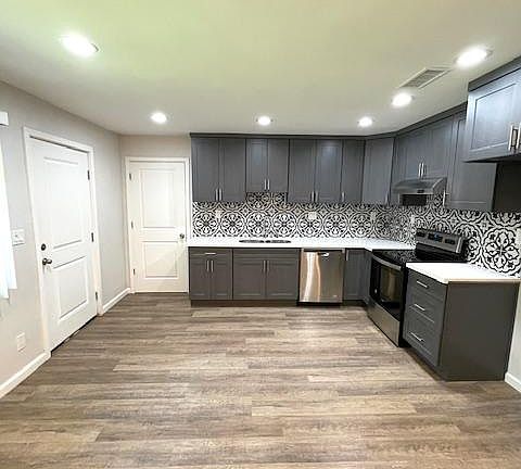 VINLY CLICK FLOORING THROUGHOUT, QUARTZ COUNTERTOPS IN KITCHEN + BATHROOM, SHAKER CABINETS IN KITCHEN, ELECTRIC STOVE + DISHWASHER, A/C