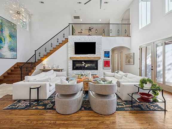 A Spanish tile roof and smooth stucco exterior open to a soaring light-filled living area with rich hardwood floors and a chef’s kitchen featuring Thermador appliances, quartz counters, and an oversized island. The serene main-level primary suite offers double walk-in closets, dual vanities, a soaking tub, and walk-in shower.