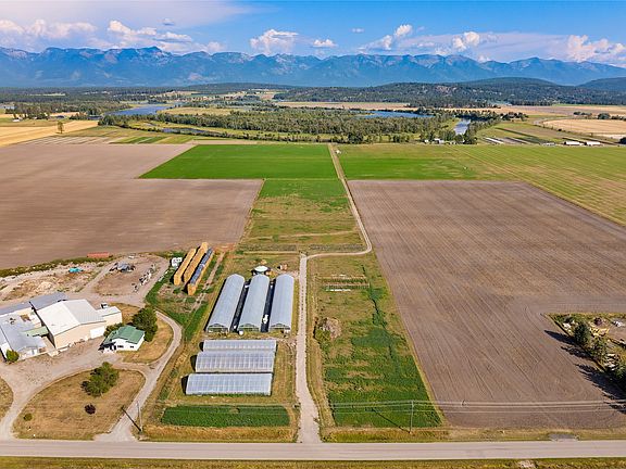 50 Acres on Lower Valley Road w/ 6 Greenhouses & a Yurt! Embrace self-sufficiency & rural tranquility on this expansive property.With 360° mountain views, Flathead Lake to the south & an idyllic level landscape, this is a rare opportunity to own versatile land with outstanding agricultural & recreational potential. Greenhouses are climate controlled, perfect for wholesale, market gardening or seed starting.The Yurt offers 2 bedrooms, dining/living space plus outdoor kitchen & laundry/shower room, perfect to live in while building your dream home or employee housing. The property is sub-irrigated, ideal for hay or crops. Grow food, start a hobby farm, or create a private retreat—this land is a blank canvas. A sizeable portion lies in the 100-year floodplain, suited for conservation or ag uses, while the area near Lower Valley Rd is outside the floodplain, offering potential for residential or commercial projects. Please see documents for septic site evaluation from Flathead County. Property has 5 fenced pastures for livestock. Posts for additional barn included, but hoop frame is excluded. Pasture corner braces made tall to allow for future high fence to keep wildlife out for crop protection. Seller willing to also sell package of 20 cows separte from property sale.