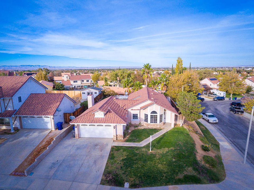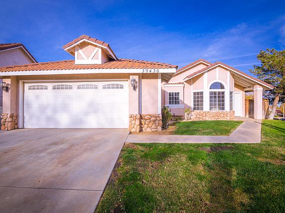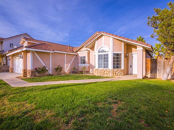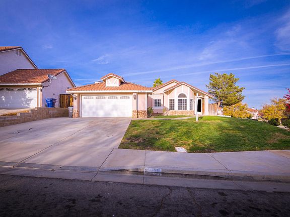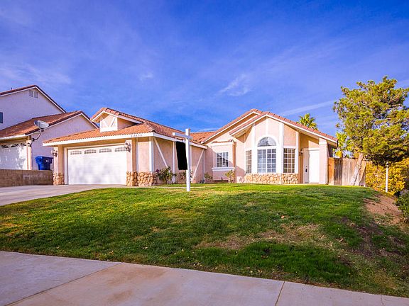 Stunning Corner Lot in great West Palmdale location! Beautifully landscaped exterior and unique interior layout will blow you away. Vaulted ceiling living room area with laminate flooring and dining area with bronzed chandelier light and bay windows. Laminate flooring continues to hallway and bedrooms which also display white closet doors and high ceilings. Guest bathroom displays travisano porcelain tiled flooring, white cabinet vanity, wall mirror, and vanity fixture. Vaulted ceiling master bedroom features nice skylight for plenty of natural sunlight and sliding glass door; porcelain tiled flooring in bathroom, large walk-in closet tub shower combo white cabinet vanity with his and her sinks. Cozy kitchen displays White cabinets with stainless steel deep double sink white appliances and