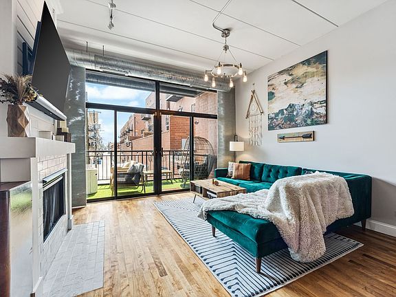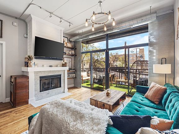 Gorgeous 2-bedroom, 2-bathroom gem on a quiet tree-lined street in the St. Ben's neighborhood of North Center! Soaring 12 ft ceilings and massive windows accentuate the rustic elegance of this soft loft, with sunlight splashing into every corner. An open floor plan boasts quartz counters in both the kitchen and bath, complemented by rustic hardwood floors and a stylin' fireplace. New stainless appliances, custom backsplash, and generous storage mean the kitchen is svelte yet functional, while your private, south-facing balcony basks in sunlight and has ample space for seating, planters, and a grill. Owner's suite enjoys two substantial closets, more than enough room for a king bed, and dual vanities. Second bedroom is fully glassed-in on top to enjoy bountiful natural light and added privacy, and serves perfectly as a home office or quiet nursery. Hardwired internet installed throughout means blazing-fast, secure, and uninterrupted data while a new furnace complete with UV sanitizer and whole-home humidifier keeps things fresh and worry-free. Of course, energy-efficient in-unit laundry, storage cage, dimmable LED lighting, and a deep, heated garage spot round out the conveniences here while close proximity to public transportation, Revere/Horner/Wells Parks, Trader Joes, bars, breweries, and much more are moments from your door. Relish quiet yet urban living at its finest, and schedule your tour today.