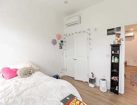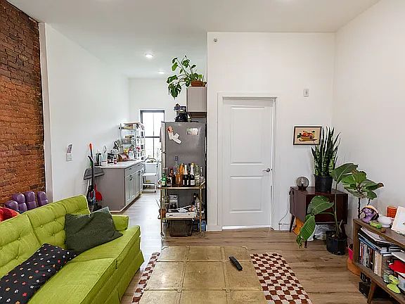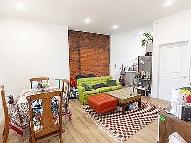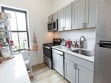 This sun-drenched, modern apartment offers a vibrant living experience with three individual bedrooms, perfect for roommates or a family seeking dedicated spaces. Enjoy the sleek, renovated kitchen featuring grey cabinetry, a bright hexagon tile backsplash, and stainless steel appliances. The open concept living area boasts a striking exposed brick accent wall, providing rustic charm alongside the contemporary light wood style flooring throughout. Each bedroom is spacious and bright, with large windows and individualized decor touches, including ample closet space and mini split AC units for personalized climate control. The updated bathroom features a modern vanity and a walk in shower with stylish tilework. This home seamlessly blends modern amenities with cozy, individual character, creating a truly unique and appealing residence.