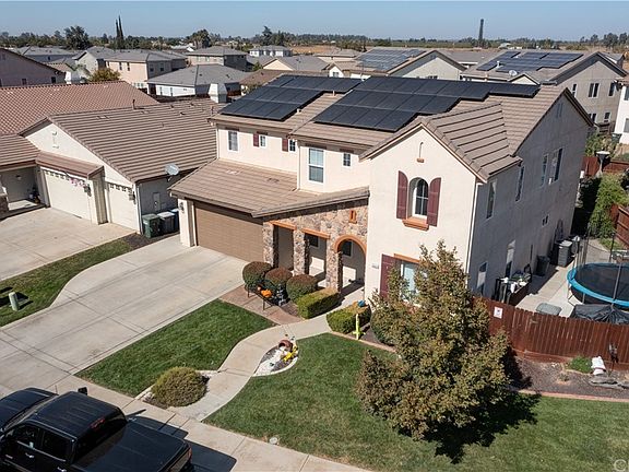 Beautiful two-story home in North Merced located on a large corner lot, boasts 6 bedrooms, 4 baths, and 3,619 sq. ft. of living space. Upon entering you will notice high vaulted ceilings, plenty of natural lighting and, a lovely tile entrance leading to a spacious living room and a formal dining room. The open kitchen is sure to impress with an oversized breakfast bar, granite countertops, beautiful maple wood cabinets, stainless steel appliances, dishwasher, gas stove, built-in microwave and oven, and a spacious pantry. This opens up to the dining area and a large family room that offers a gas fireplace perfect for those chilly evenings, maple-built ins cabinets, lots of windows, and carpet flooring. Spacious bedrooms and bathroom downstairs, the laundry room is located upstairs with plenty of cabinets and a sink for convenience. Upstairs you will also find the rest of the bedrooms with a jack and jill bathroom. Gorgeous master suite, oversized with a double walk-in closet, his and hers sinks, bathtub, giant walk-in shower, and completely tiled throughout. The backyard is landscaped all around, lots of grass area, concrete area perfect space for a gazebo, shed in back, large side parking area, and double gates for RV or Boat parking. Bonus features include new solar panels, an alarm system, and a new surveillance system.