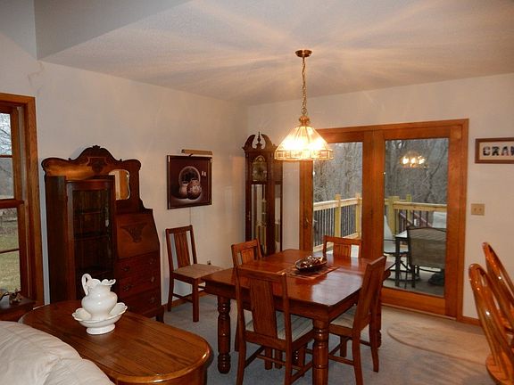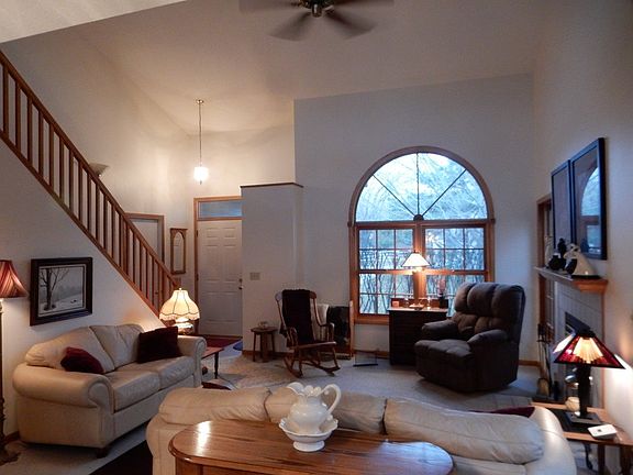 Nice 1 1/2 story home nestled on 1.68 acres w/a beautiful yard & lots of trees! Open living rm w/cathedral ceiling & wood burning fireplace, offering master on the main level and 2 bedrooms up! Walk out lower level w/family rm, rec rm, 1/2 bath, storage & bonus area! Newer deck, newer gutters @ 5 yrs ago. Extra storage in garage w/pull down attic access plus large shed in back! Community well & private septic. HOA annual dues $320.