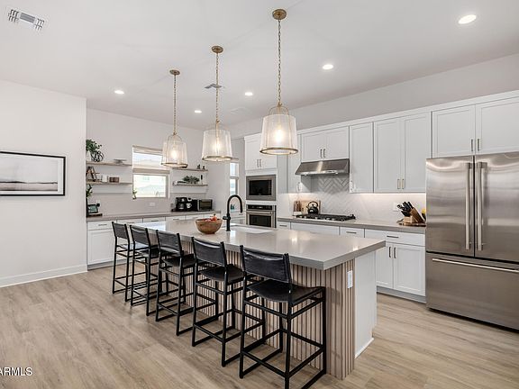 Experience elevated modern living in this nearly new Claremont model by Toll Brothers at The Preserve at San Tan. Featuring 4 bedrooms, 3 baths, and including a downstairs suite, this home blends luxury, comfort, and functionality. The gourmet kitchen boasts quartz counters, full height cabinets, gas cooktop, and a sleek multi-panel pocket sliding door that opens seamlessly to the finished backyard with pergola, pavers, and turf. Designer selected upgrades, custom lighting, and window coverings add a polished touch. Enjoy resort style community amenities - pickleball, basketball, dog park, and more - all just minutes from top shopping, dining, and local educational opportunities. This gorgeous three car garage home is move-in ready and priced to outperform any new build!