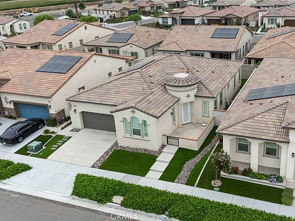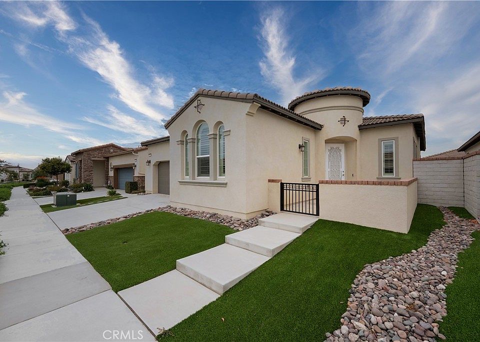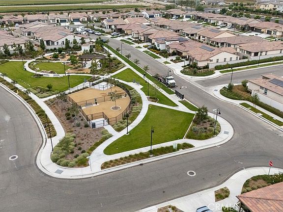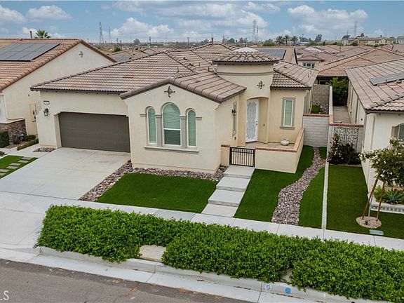 Welcome to resort-style living in the heart of Ontario Ranch! This beautifully upgraded home, located in the exclusive gated Esperanza 55+ community, offers over 1,800 SF of thoughtfully designed space perfect for comfort, entertaining, and everyday ease. From the moment you arrive, the beautiful curb appeal invites you in, low maintenance landscaping, sets the tone for effortless living. Inside, you'll find soaring 9-foot ceilings, luxury vinyl flooring throughout, and an abundance of natural light thanks to oversized windows with custom shutters. The heart of the home is the chef’s kitchen featuring a massive center island, stainless steel appliances, and sleek cabinetry ideal for gatherings with friends and family. The open concept layout flows seamlessly into the living and dining areas, while a versatile flex room offers the perfect space for a home office, craft room, or potential third bedroom. The spacious primary suite includes dual vanities, an oversized spa-style shower, and a generous walk-in closet. A secondary bedroom, large laundry room, and built-in cabinetry add even more function to the floor-plan. Step in the backyard and experience tranquity with the covered patio, landscaped yard, and mountain views. As a resident of Esperanza, enjoy access to the resort-inspired La Jolla Clubhouse featuring a fitness center, pickleball court, pool, bar, outdoor kitchen with BBQ, fire pits, and even a dog park. This home is the perfect blend of modern luxury and low-maintenance living designed for those who want to live life to the fullest in a vibrant, active adult community. Schedule your showing today, and see all this home and community has to offer!