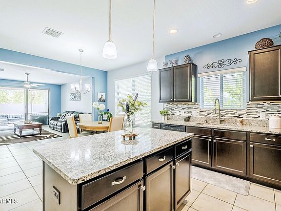 Gorgeous four bedroom home in San Tan Heights. Stunning low-maintenance backyard features a covered patio with a custom extended patio--perfect for entertaining! Synthetic grass creates a play area with no upkeep. Premium lot backs up to a greenbelt so you have tons of privacy with no neighbors behind you. Home has four bedrooms plus a den/office/music room or formal living or dining area adjacent to the front entry. Two-and-a-half baths. The kitchen features granite counters, stainless steel appliances (including a gas range!), and an island with breakfast bar. The great room has a wide open floor plan with tons of light. The primary bedroom has an en suite bathroom with two sinks, and a walk-in closet with custom shelving. Laundry room has additional storage and custom tile wall.