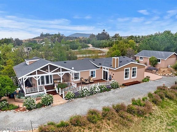 You don't want to miss this property! It's truly a MAGICAL WONDERLAND in the HEART OF TEMECULA WINE COUNTRY with amazing views and park-like grounds close to wineries. 1.94 Acres zoned C/V (Citrus/Vineyard) and NO HOA. Flat, useable land in the front & rolling meadow in the back. Perfect for horses, fully fenced, room to add ADU, barn, outbuilding or plant a vineyard. HOT AIR BALLOONS are part of your daily views while hanging out in the gazebo or relaxing in the hot tub or swing on the covered wrap-around deck. MULTI-GEN manufactured home on permanent foundation has 2,416sf, 4 Bedrooms + Office, 3 Baths, with Studio En-Suite & Kitchenette, walk-in closet + private entrance, perfect for guests, extended family or RENTAL INCOME + 3-car detached Garage. There are also 4 drive-through gates, 3 access gates, plus a separate area for your RV with hookups, 2 fire hydrants, 2 septic tanks, above ground private spa and much more. Only love and thoughtfulness has gone into creating this tranquil oasis with flagstone pathways, landscaping, oak tree canopy over the circular drive and did we say views? YOU WILL LOVE THIS PLACE!!! (Don't forget to check out the virtual tour link.)