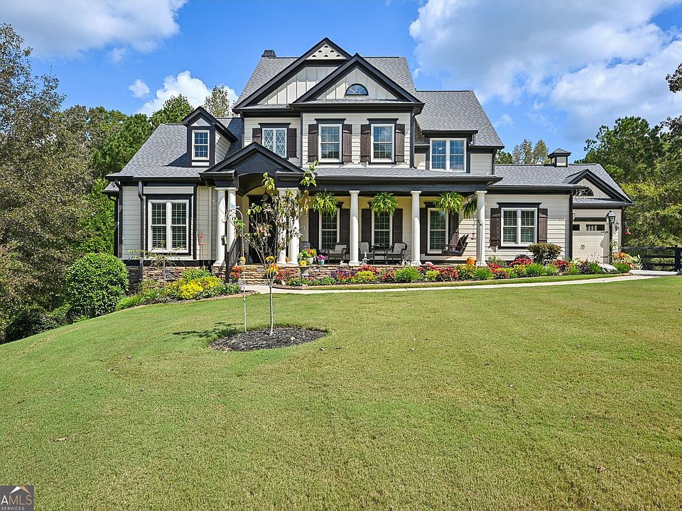 This home truly has room for everyone in this 6-bedroom, 4.5-bathroom home that perfectly blends elegance, functionality, and comfort. Featuring multiple levels of living space, this property offers everything you need for luxurious everyday living and entertaining - from a main-level primary suite to a fully finished basement with its own kitchen. With the primary bedroom on the Main Floor, enjoy convenience and privacy in the spacious owner's suite, complete with an ensuite bath and ample closet space. The main living area flows seamlessly onto the deck with lake views, perfect for indoor-outdoor living. Walk into the well-appointed kitchen with modern appliances, plenty of counter space, and storage for the home chef. The kitchen flows into a breakfast nook and keeping room with an additional fireplace. Off of the breakfast nook there is a screened in sunroom with lake views! Don't forget the charming front porch featuring ceiling fans and a swing, one of the largest in the neighborhood, ideal for warm summer evenings. Three spacious bedrooms and two full bathrooms offer comfort and flexibility for family or guests. A versatile loft area perfect for a playroom, office, home gym, or reading nook. The finished basement includes 2 bedrooms, 1 full bathroom, and a full kitchen. Ideal for in-laws, guests, or a private rental suite. Walk out directly to the lower deck, providing additional outdoor living and entertainment space. Newly installed fence and beautiful landscaping in the front and back will not disappoint!