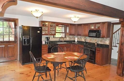 This immaculate open-plan cape is perfect for entertaining. The gourmet kitchen features cherry cabinets, granite counters and a dutch door opening to a beautiful backyard oasis with deck and cabana area overlooking the spacious groomed yard. The back of property is nicely wooded, and holds a large shed or artist's studio that has power and lights. Gorgeous wood floors throughout the home, and a comfortable master bedroom with his-n-hers closets. The massive family room with fieldstone (gas) fireplace sits above the oversized 2 car garage. While it's listed as a 3 bedroom home, there are actually 2 additional guest rooms - the possibilities abound. A 13kW generator, additional gardening shed, fire pit, and many more delights await you. This home has many upgrades and has been lovingly maintained.. Just minutes from the Mass Pike - an easy commuter location with all the luxuries of a rural retreat. Come see it, and you'll want to make this your new home.