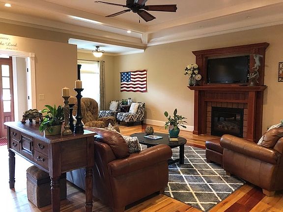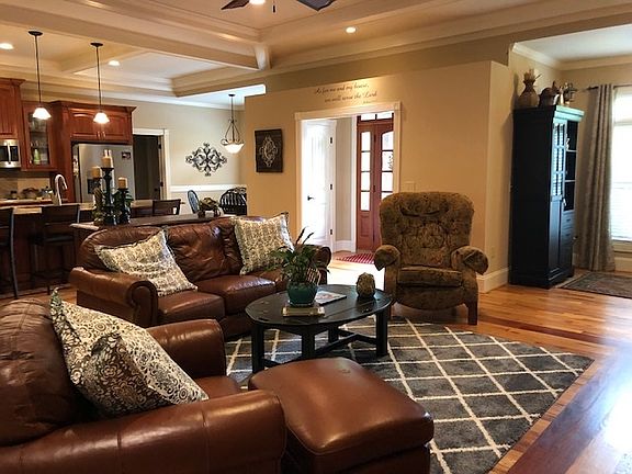 Enter the gate to this custom built home nestled on 3+ private acres with a creek. Interior features boast of an open floor plan. Beautiful kitchen with custom cabinets, granite counter tops, double wall ovens, stainless steel appliances, center island for extra seating, opens to the breakfast area and the heart of the home. Living room has fireplace with gas logs, plus additional sitting area and leads to sun room and dining room that overlook the rear patio. A grand master suite with 2 walk-in closets, his/her vanities, garden tub, separate shower and laundry. Lower level has an office and powder room. Upper level consists of 2 bedrooms with walk-in closets, full hall bath, sewing room, bonus room and walk out attic. Three car garage with side door entry, circular driveway and lots of additional parking for guests. Beautiful wood and tile floors, coffered ceiling and lots of storage. Detached building with electricity. Located minutes to the interstate.