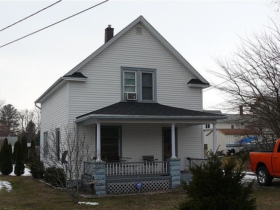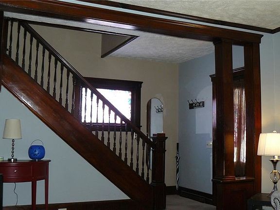 Looking for low maintenance, low cost living? Take a look at this home! Major exterior work completed. Vinyl siding, newer windows. Roof is only 4 years old. Gutters only 1 year old! The large front porch is inviting you to sit and enjoy warm evenings. The wood front door opens into a foyer with natural woodwork and an open stairway to the upper floor. Beautiful wood trim/columns in living room and dining room. Kitchen has original wood cabinet. Bathroom totally redone in last four years. First floor laundry. 3 spacious bedrooms grace the upstairs. Basement is dry. Nice large yard as well as a one car detached garage. Hardwood floors can be found under the living and dining room carpet. Make your appointment today!