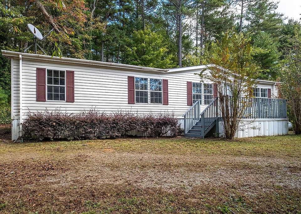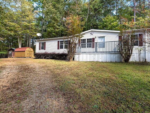 Tucked away on over 3.5 private, wooded acres, this 3-bedroom, 2-bath manufactured home offers peace, privacy, and plenty of potential. A long gravel driveway winds from the paved road through the trees, opening up to a spacious clearing with two handy outbuildings - one of which is plumbed for a sink, shower, and toilet - and ample room for multiple vehicles. Step up onto the front deck and into the comfortable living room, a bright and open space ready for your personal touch. The adjoining kitchen provides an abundance of cabinet and counter space, along with a roomy dining area that easily accommodates a full-sized table. Just off the kitchen is the laundry room, with a back door that leads to a covered porch and ramp for easy access to the yard. Adjacent to the kitchen is a cozy den with a gas-log stove, offering warmth and charm. The home's split-bedroom floor plan provides privacy for the Master Suite, which is located just off the living room, with a large walk-in closet and an en suite bathroom with double vanities, a relaxing garden tub, and a separate step-in shower. Two additional bedrooms and a full guest bathroom are located off the den, giving family or guests their own comfortable retreat. While the home could use some cosmetic updates and a bit of TLC, it's fully livable as it stands. The surrounding acreage provides endless possibilities: enjoy nature, add a garden, or simply relax and take in the peaceful wooded setting. If you're looking for a private country retreat with room to spread out and make your own, this property is full of charm, space, and potential.