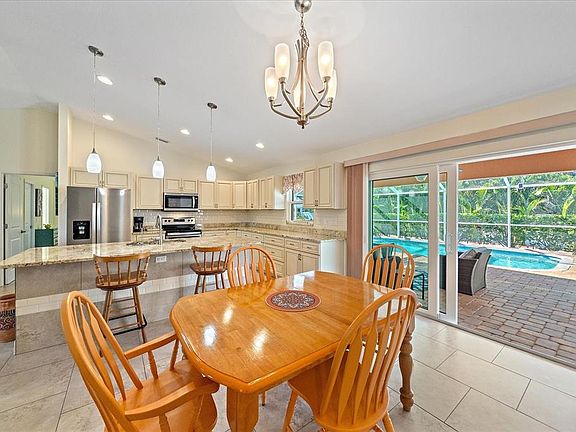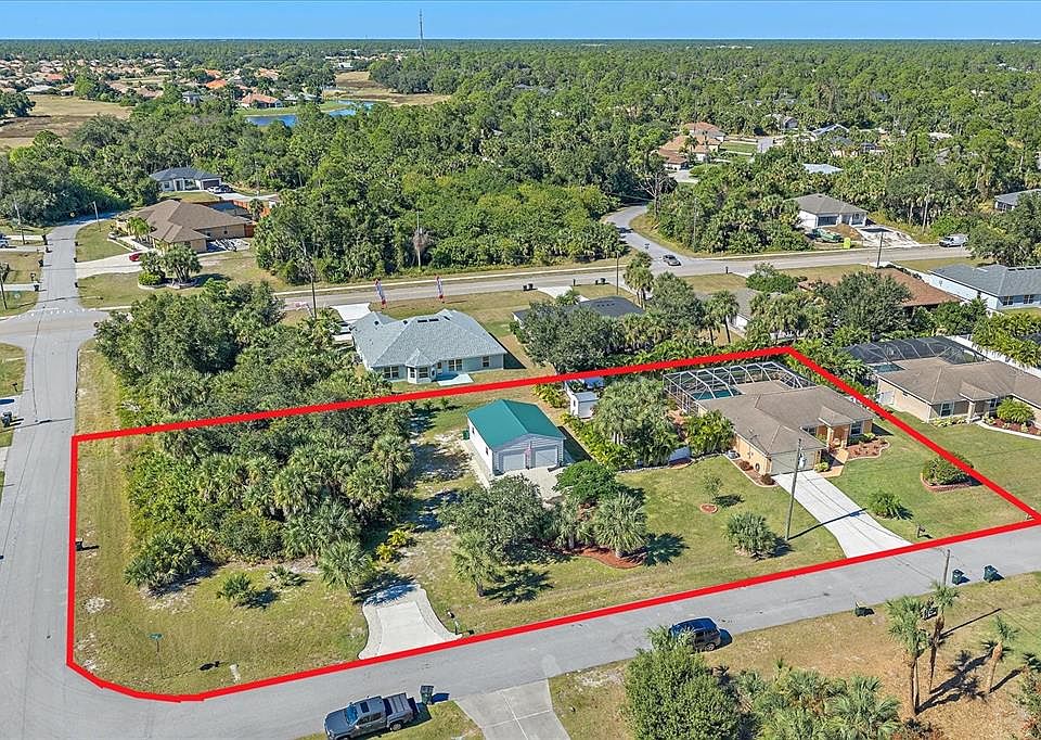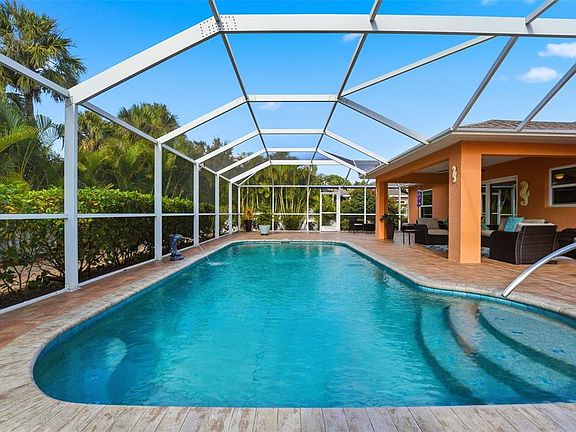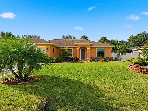 Welcome to 3950 Derrick Street, where you'll find this beautiful like new home situated on nearly 3/4 ACRE with a CUSTOM HEATED SALTWATER POOL and NEW DETACHED BUILDING. This rare find encompasses 3 lots. Built in 2018, the "Orion" model by Gulfstar Homes offers a split bedroom open-concept floor plan with vaulted ceilings and spacious kitchen featuring an island with breakfast bar, granite countertops and stainless steel appliances. The primary bedroom is a generous 15 x 16 with a walk-in closet. The primary bathroom offers dual-sinks and a large walk-in shower. Recent updates include epoxy garage floor (2025), refrigerator (2025), microwave (2024) and dryer (2024). You'll love how the 20" porcelain tile flooring flows consistently throughout the home! Built to keep insurance and energy costs low with PGT Winguard impact windows and impact doors (no need for hurricane shutters here). Sliding glass doors from the dining room lead out to a stunning tropical setting! The 30 x 50 brick paver patio surrounds a beautiful 12 x 26 custom heated saltwater pool with water feature by Superior Pools. Mature palm trees line the extended vinyl fence in the backyard to ensure privacy. Also included on the beautifully landscaped property are several blooming trees/plants including a royal poinciana, bougainvillea and bottlebrush. 4-zone irrigation system on two of the lots. In 2024 a new designated concrete driveway was installed leading to an insulated detached 24 x 30 building with built-in benches, shelves and two overhead doors. Also included is a 9000-watt electric start Predator generator (capable of powering the whole home). Bring your toys, you'll have RV hookup, plenty of space for your parking/storage needs and more room to expand, build or divide. Extra Features include a hurricane impact rated aluminum shed with shelves for additional storage. Lots of options and in a perfect setting for your Florida home and property! Offered PARTIALLY FURNISHED. Located in Sarasota County near shopping, restaurants, parks, medical, schools and more! Easy access to I-75 and HWY 41/ S. Tamiami Trail. Schedule a showing today.
