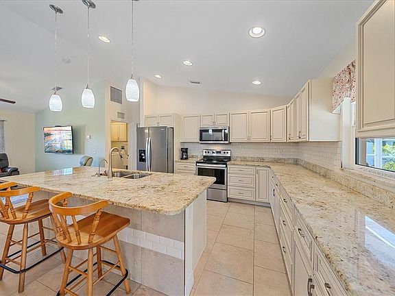 Island with breakfast barCustom heated saltwater poolGranite countertopsNew detached buildingVaulted ceilingsSpacious kitchenStainless steel appliances